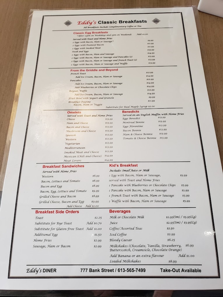 Eddy's Diner, nestled in Ottawa's charming Glebe neighborhood, is a delightful culinary haven just a stone's throw from Lansdowne Park and minutes from the bustling downtown core. This quaint diner has quickly become a beloved spot for locals and visitors alike, offering a warm and inviting atmosphere that feels like a home away from home. Specializing in classic diner fare, Eddy's Diner serves up a delectable array of burgers, shakes, floats, and an all-day breakfast menu that satisfies cravings at any hour. Whether you're in the mood for a hearty breakfast poutine, a refreshing milkshake, or a locally crafted beer, Eddy's has something to delight every palate. The menu, though simple, is crafted with care, ensuring each dish is both comforting and delicious. Eddy's Diner is more than just a place to eat; it's a community hub where friends, families, and neighbors gather to enjoy good food and great company. The friendly and attentive staff make every visit special, providing speedy service with a smile. From the crispy bacon to the freshly grilled chicken wraps, each meal is prepared with a dedication to quality and flavor.